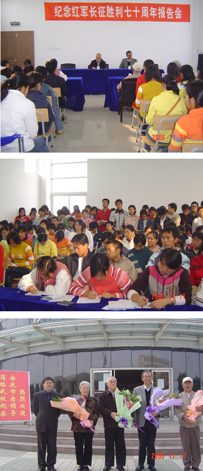 11月11日上午,校關心下一代工作委員會和團委聯合舉辦了紀念紅軍長征勝利七十周年報告會。報告會由關工委主任朱建華同志主持,參加過紅軍長征的90歲高齡的老紅軍駱斌為我們講述了當年紅軍長征的事跡。近百名大學生聽聆聽了報告。