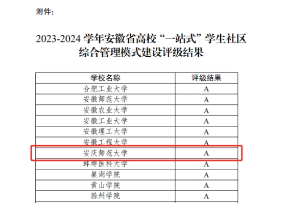 近日,安徽省委教育工委公布2023-2024學(xué)年安徽省高校“一站式”學(xué)生社區(qū)綜合管理模式建設(shè)評(píng)級(jí)結(jié)果,經(jīng)學(xué)校自評(píng)、專(zhuān)家會(huì)評(píng)、實(shí)地核查、評(píng)委會(huì)審議等程序,我校獲評(píng)A級(jí)高校,全省參與建設(shè)評(píng)級(jí)高校中共有18所入選A級(jí)、30所入選B級(jí)、70所入選C級(jí)。