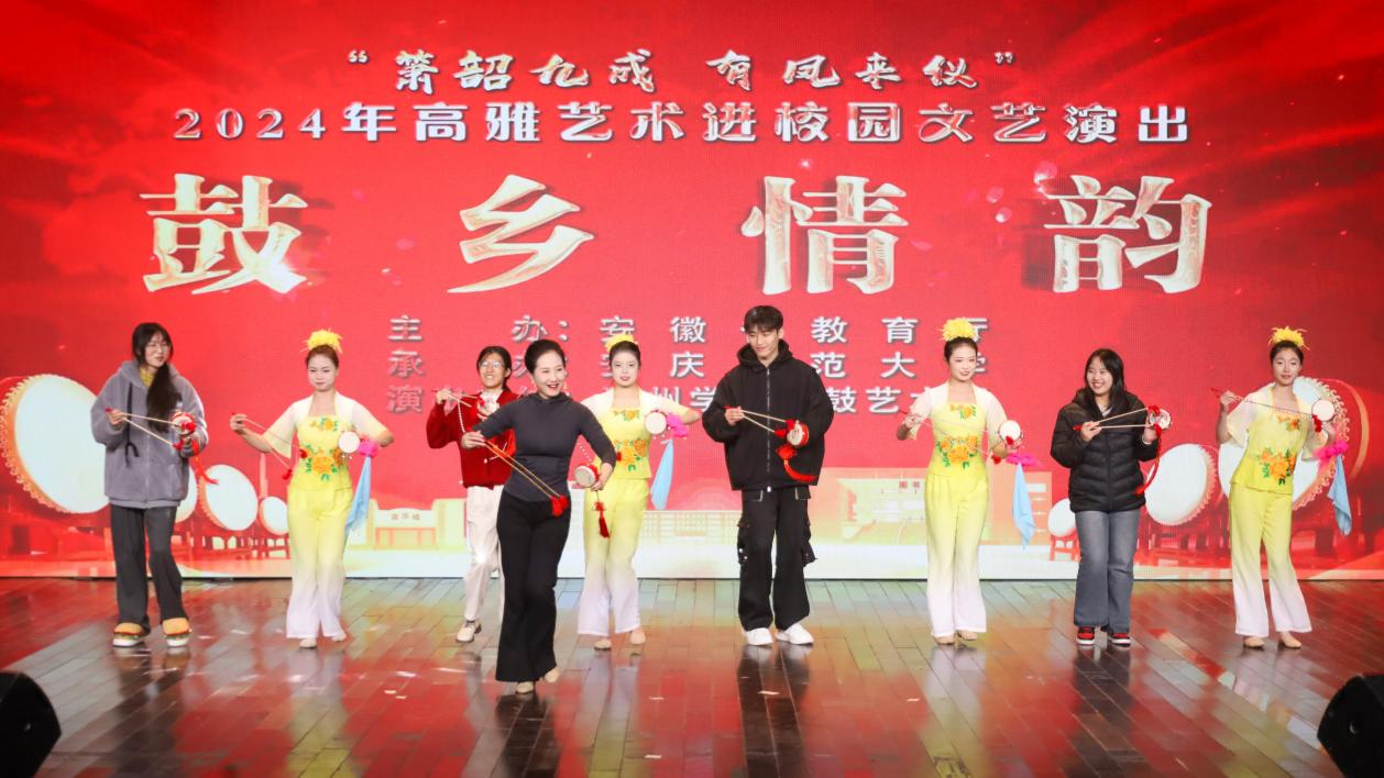婀娜多姿的舞蹈、獨具特色的花鼓、磅礴悠揚的歌聲……11月28日,由安徽省教育廳主辦的“蕭韶九成,有鳳來儀”2024年高雅藝術進校園——“鼓鄉情韻”專場演出在我校龍山校區音樂廳舉行,我校師生350余人到場觀看演出。
