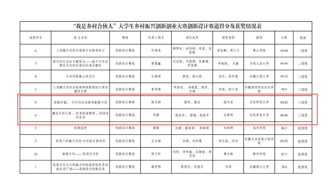 11月24日,“我是鄉(xiāng)村合伙人”大學(xué)生鄉(xiāng)村振興創(chuàng)新創(chuàng)業(yè)大賽決賽在蕪湖舉辦。我?!短飯@詩(shī)篇:天河村生態(tài)景觀重塑計(jì)劃》《建設(shè)鄉(xiāng)間小道,傳承鐵道精神,創(chuàng)造休閑生活》2項(xiàng)作品榮獲三等獎(jiǎng)。