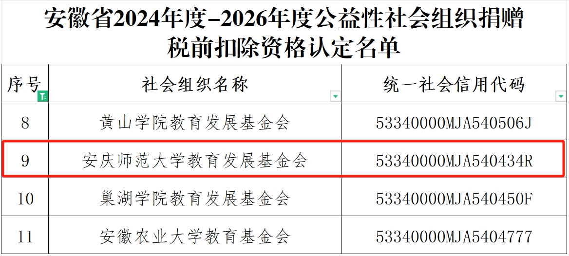近日,安徽省財政廳、國家稅務(wù)總局安徽省稅務(wù)局、安徽省民政廳聯(lián)合公布2024年度-2026年度公益性社會組織捐贈稅前扣除資格認(rèn)定名單。我校教育發(fā)展基金會位列其中,這標(biāo)志著企業(yè)或個人通過我校教育發(fā)展基金會開展符合法律規(guī)定的公益慈善事業(yè)捐贈支出,可以按稅法規(guī)定在計算應(yīng)納稅所得額時享受稅收扣除優(yōu)惠政策。