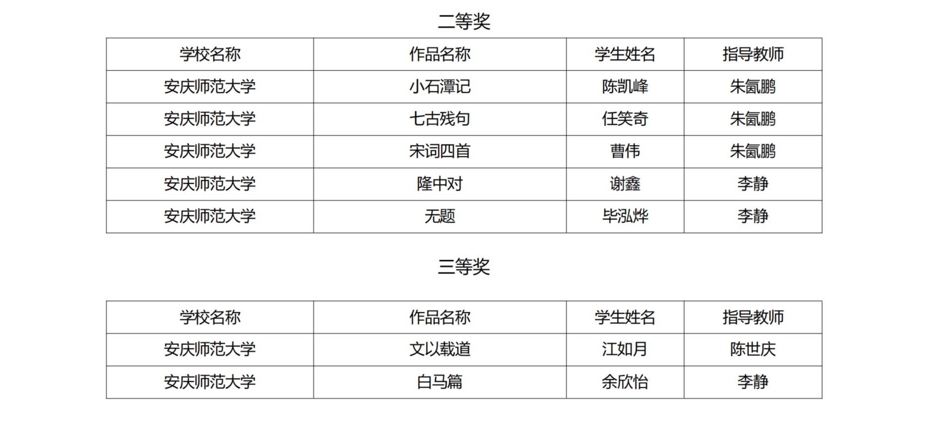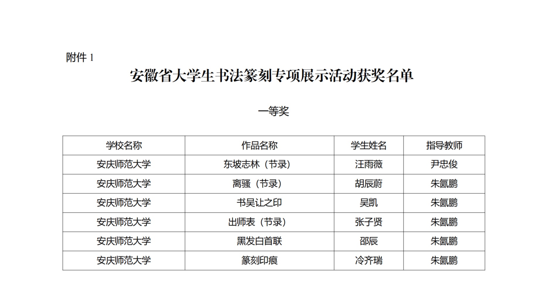 近日,安徽省教育廳、安徽省文學(xué)藝術(shù)界聯(lián)合會共同組織開展的安徽省大學(xué)生書法篆刻專項展示活動評選結(jié)果公布。我校共有13件學(xué)生作品獲獎,其中一等獎6項,二等獎5項,三等獎2項,尹忠俊與朱氤鵬被評為優(yōu)秀指導(dǎo)教師。