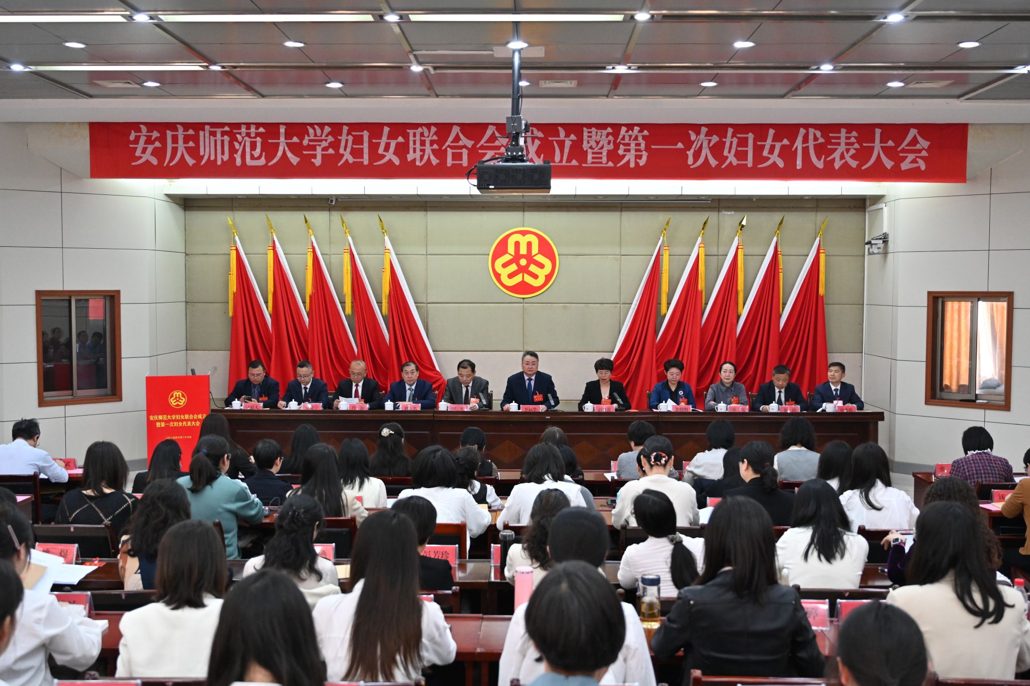 3月26日,學校婦女聯合會成立暨第一次婦女代表大會在行政樓一樓會議室召開。校黨政領導李福華、彭鳳蓮、崔明、劉友忠、吳瓊、肖新、秦朗、徐曉寧、申傳勝、計裕人出席會議。安慶市婦聯黨組書記、主席金秋明應邀出席會議。全校婦女代表參加會議。各單位和各學院黨政主要負責人列席會議。校長彭鳳蓮主持開幕式。