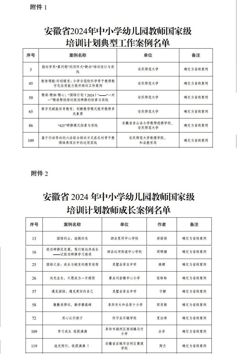 日前,安徽省教育廳發(fā)文公布了2024年中小學(xué)幼兒園國家級培訓(xùn)計(jì)劃典型工作案例和教師成長案例名單,我校報(bào)送的6項(xiàng)工作案例和9個(gè)教師成長案例成功入選,入選案例數(shù)創(chuàng)歷史新高。