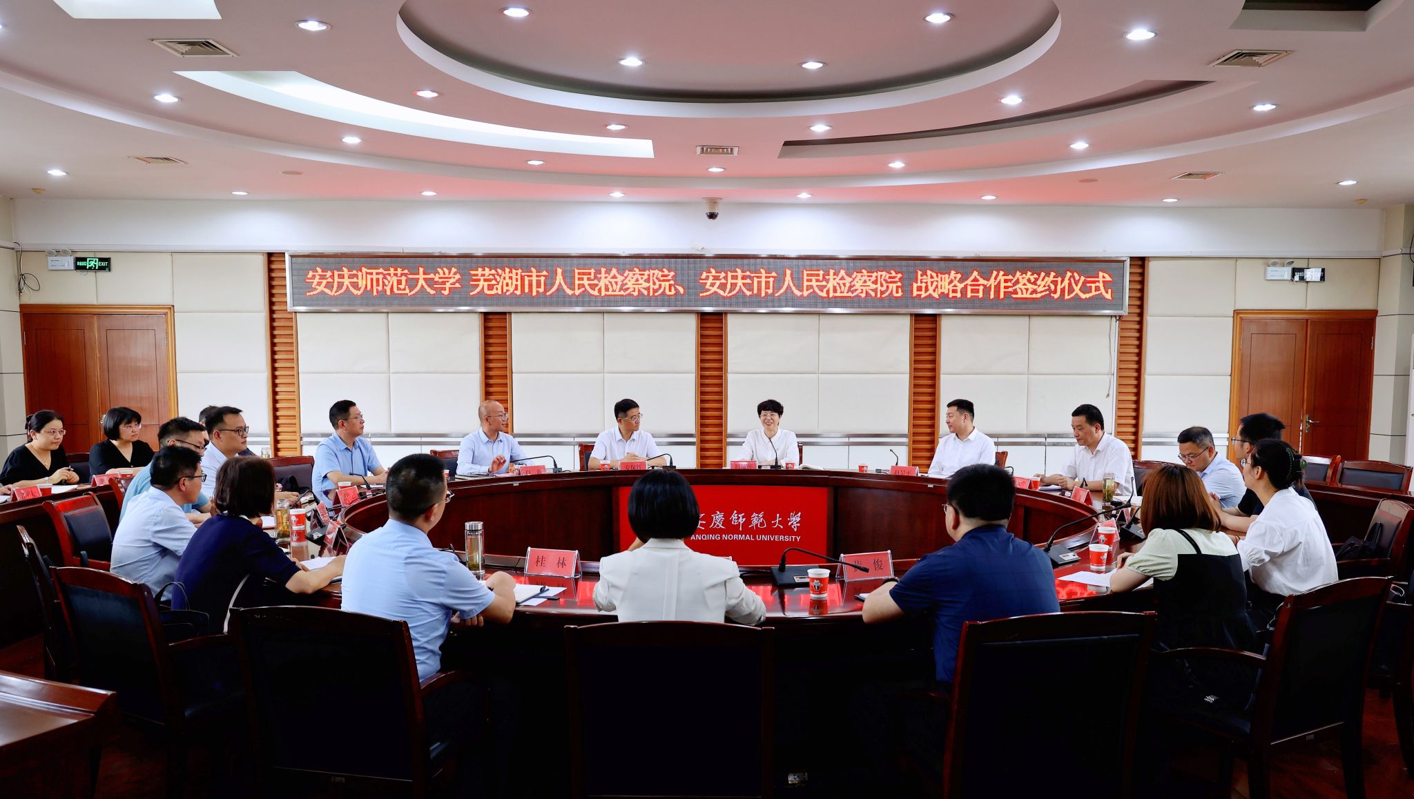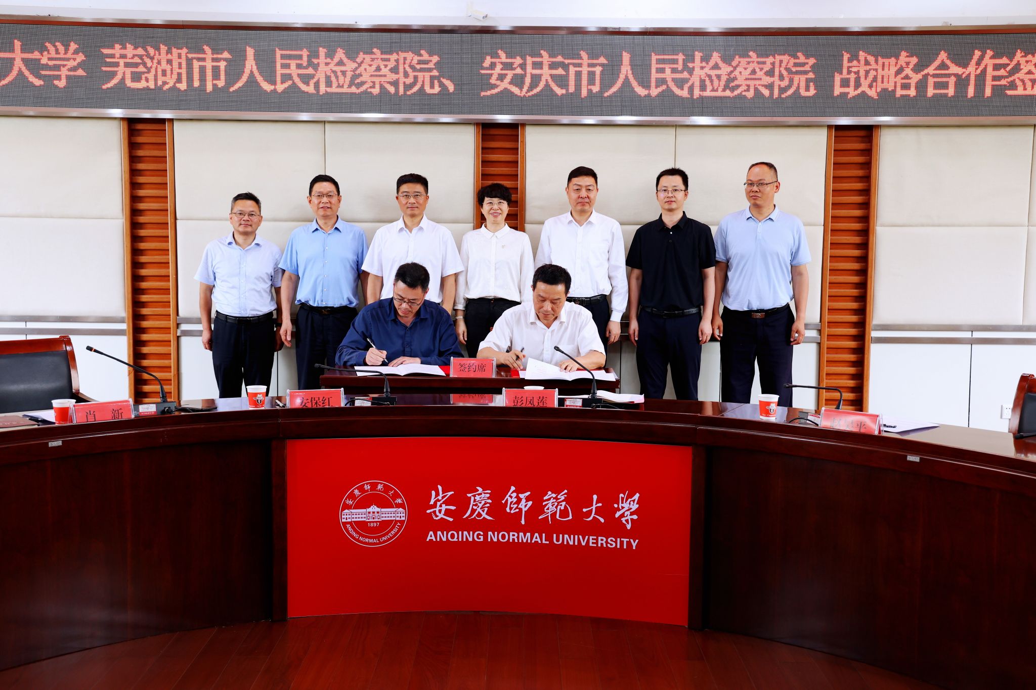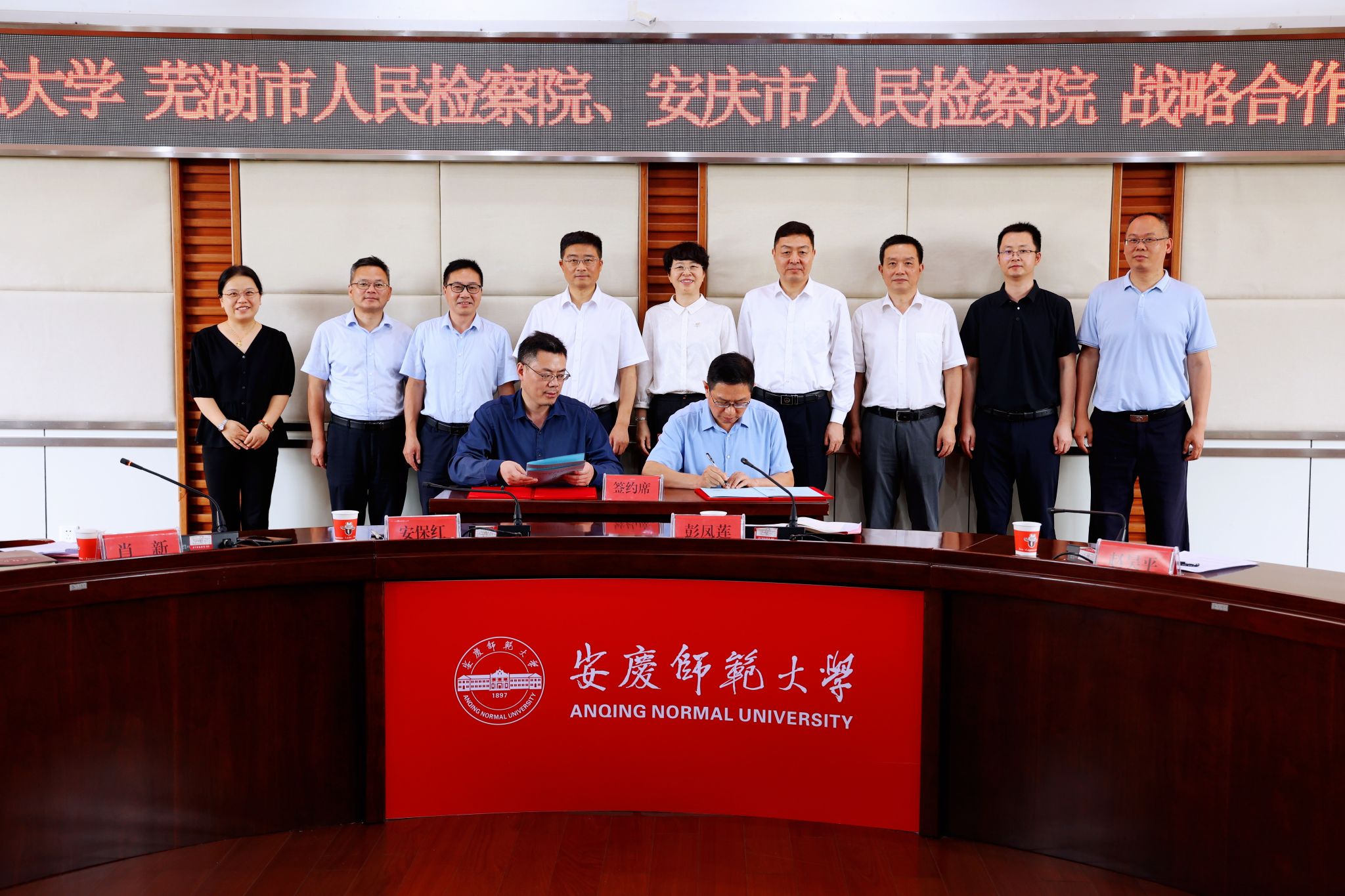 6月19日,學校與蕪湖市人民檢察院、安慶市人民檢察院舉行戰略合作簽約儀式。校長彭鳳蓮,蕪湖市人民檢察院黨組書記、檢察長趙昊平,安慶市人民檢察院黨組書記、檢察長安保紅,蕪湖市人民檢察院黨組副書記、副檢察長丁必勇,安慶市人民檢察院黨組副書記、副檢察長李振宏,蕪湖市人民檢察院黨組成員、政治部主任王明,安慶市人民檢察院黨組成員、政治部主任陳團結出席。儀式由校黨委常委、副校長肖新主持。
