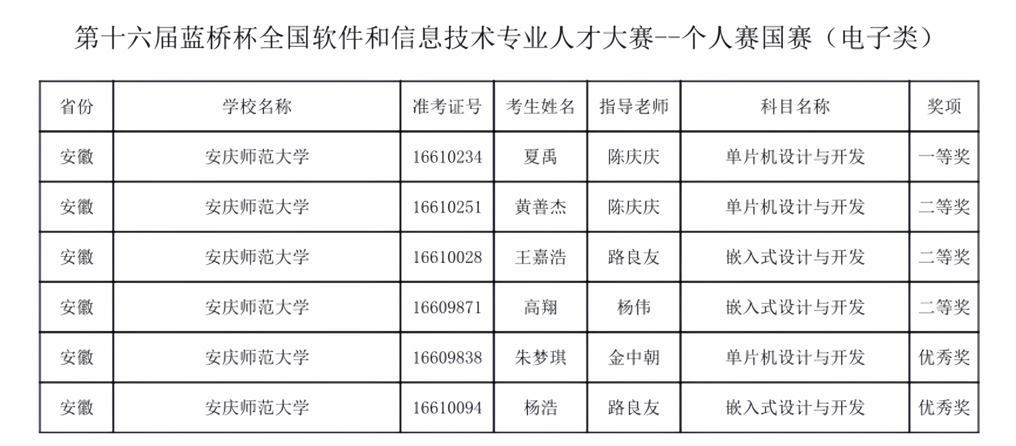 近日,第十六屆“藍橋杯”全國軟件和信息技術專業人才大賽全國總決賽落下帷幕。我校電子工程與智能制造學院學生在電子類比賽項目中獲一等獎1項、二等獎3項、優秀獎2項,計算機與信息學院學生在軟件類比賽項目中獲二等獎2項、三等獎5項、優秀獎2項。