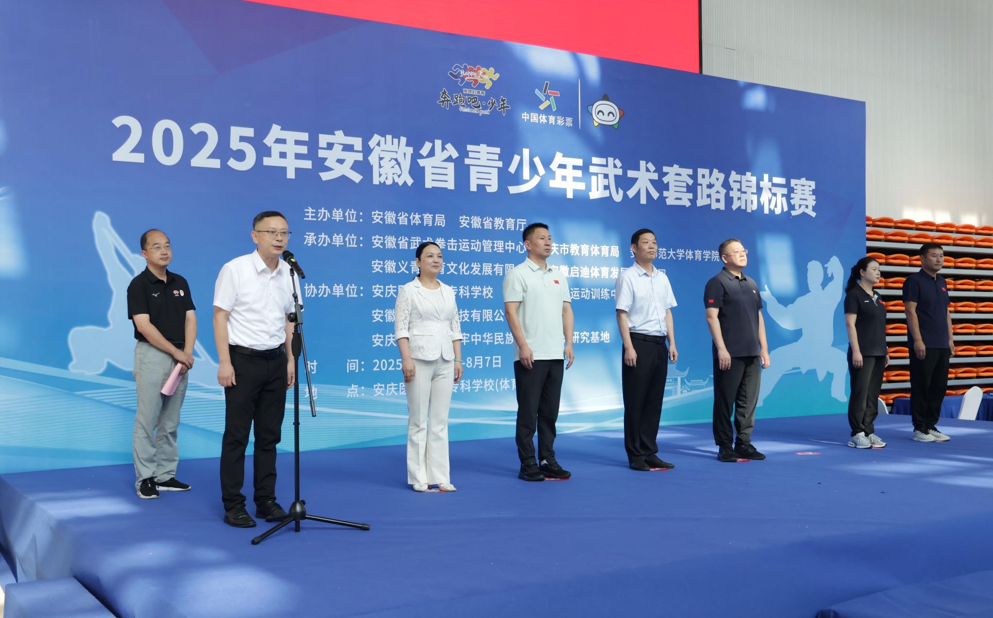 8月3日上午,由我校參與承辦的2025年安徽省青少年武術套路錦標賽在安慶醫藥高等專科學校體育館舉行開幕式。本次錦標賽由安徽省體育局、安徽省教育廳主辦,我校與安徽省武術拳擊運動管理中心、安慶市教育體育局、安徽義青體育文化發展有限公司共同承辦,安慶醫藥高等專科學校等單位協辦。校黨委常委、副校長徐曉寧,安徽省武術拳擊運動管理中心黨總支書記、主任魏良忠和辦公室主任王曉偉,安慶市教體局副局長吳敏,安慶醫藥高等專科學校副校長毛以成和黨委委員、黨政辦主任陳琪,我校體育學院負責同志出席了開幕式。