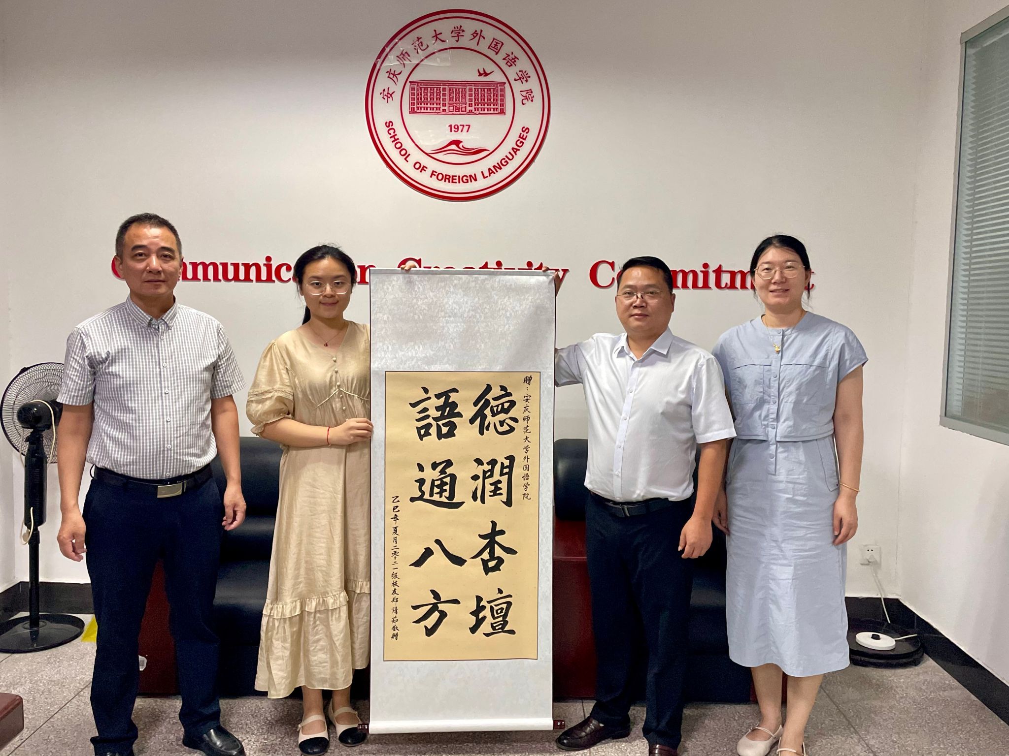 依依惜別之際,學子深情反哺。畢業生代表飽含對外國語學院的感恩與眷戀,精心創作并敬獻了一幅遒勁有力的書法作品。宣紙之上,“德潤杏壇,語通八方”八個大字墨香四溢、力透紙背。“德潤杏壇”是對學院立德樹人、春風化雨培育之恩的崇高禮贊,彰顯了外院精神的深厚底蘊;“語通八方”則一語雙關,既點明了外語專業溝通世界的核心使命,也寄托了學子們以語言為橋、融通中外文化、服務國家發展的遠大志向。
