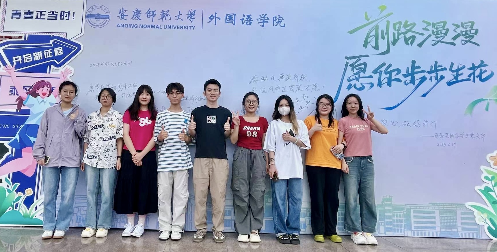 學校畢業典禮外國語學院分會場氣氛莊重而熱烈,畢業生代表線上線下同步參與主會場盛況及學位授予儀式。儀式結束后,“青春紀念墻”前人頭攢動,“不忘初心,砥礪前行”“前程似錦,未來可期”“離別總是匆忙又深情”……字里行間滿載著對母校的感恩與對未來的憧憬。學子們駐足、書寫、合影,讓這面墻成為青春記憶的永恒載體,也彰顯了外語學子溝通世界的志向。