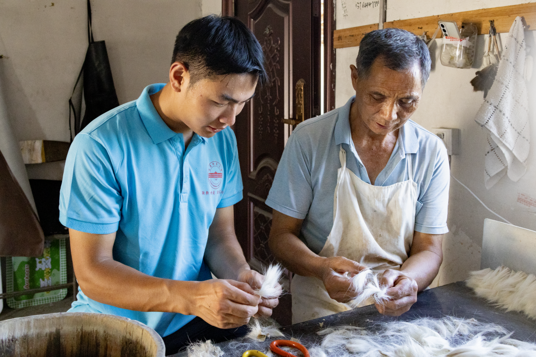 捏起一小撮羊毛,仔細比對毛鋒的長度,剔除其中雜亂的絨毛,團隊負責人、體育教育專業2023(4)班劉慶源跟著老師傅學習選料技巧?!靶P選料講究‘尖、齊、圓、健’,太軟太硬都不行?!笨此坪唵蔚姆謷幼?,在老師傅的講解下卻“暗藏玄機”?!懊恳桓撩木珳嗜∩幔际墙橙藢ΑP有四德’的極致追求,這份藏在細節里的堅守,正是宣筆文化綿延不絕的生命力?!眲c源表示,團隊愿做宣筆文化的傳播者,讓這份跨越千年的匠心被更多人知曉。