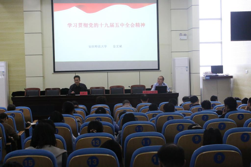 11月18日中午,安慶醫藥高等專科學校黨委在圖書館學術報告廳舉行11月份第二次理論學習中心組(擴大)學習會議,邀請安慶師范大學馬克思主義學院金文斌教授作“十九屆五中全會精神”專題輔導講座。安慶醫藥高等專科學校校領導、校本部副科級以上干部、處長(主任)助理、系部秘書、兼職思政課教師、專兼職輔導員,附院領導班子成員參加會議。安慶醫藥高等專科學校紀委書記陳燚主持學習會。