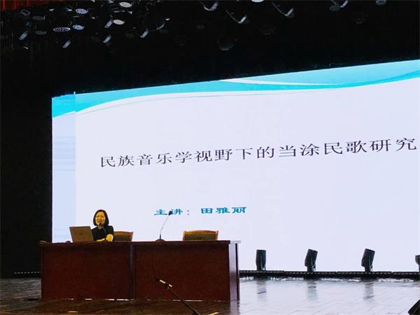 田雅麗教授首先簡要介紹了民族音樂學的概念、研究對象和研究理念,隨后評述了當涂民歌的歷史源流、總體特征和研究現狀,最后向大家分享自己對當涂民歌進行田野調查、搜集整理、創作改編、演出實踐的經驗。田教授的報告既科學嚴謹,又活潑生動,她與師生分享了大量采風與演出的視頻,更親自范唱了兩首當涂民歌,從而拉近了廣大師生與民間音樂的距離,使該院師生深切地感受到了民間音樂的魅力。