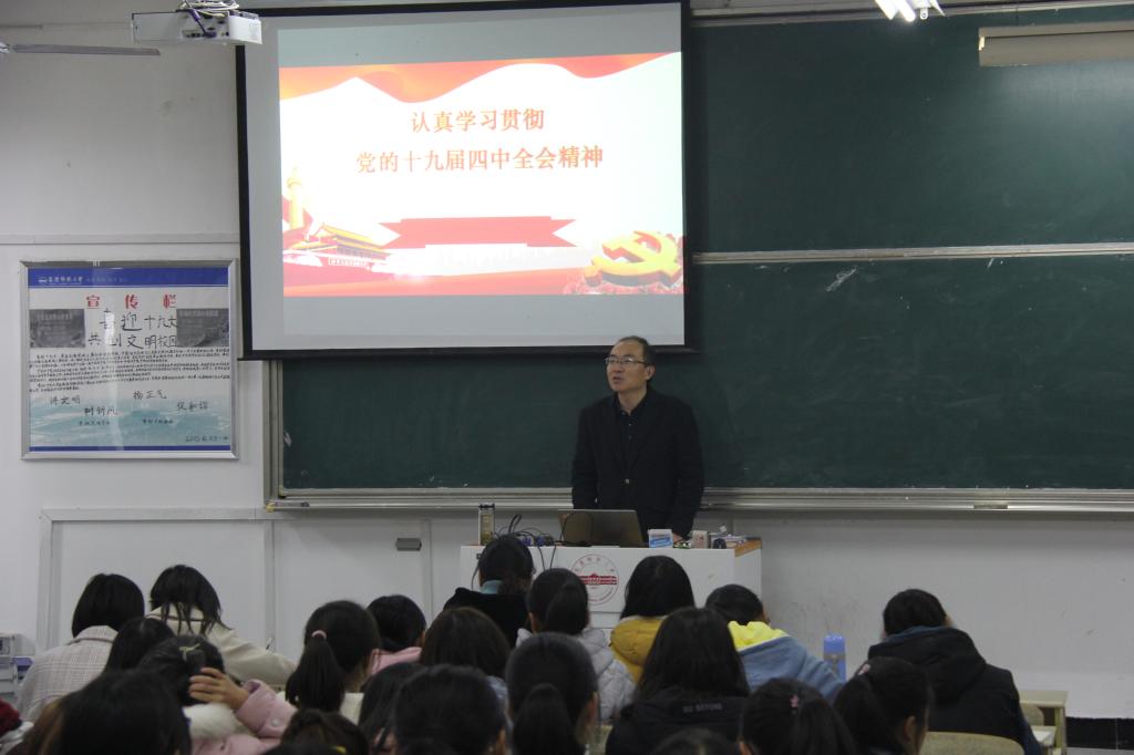 11月26日,在教學樓A樓201教室,馬克思主義學院金文斌教授為思想政治教育專業2019級學生宣講黨的十九屆四中全會精神。