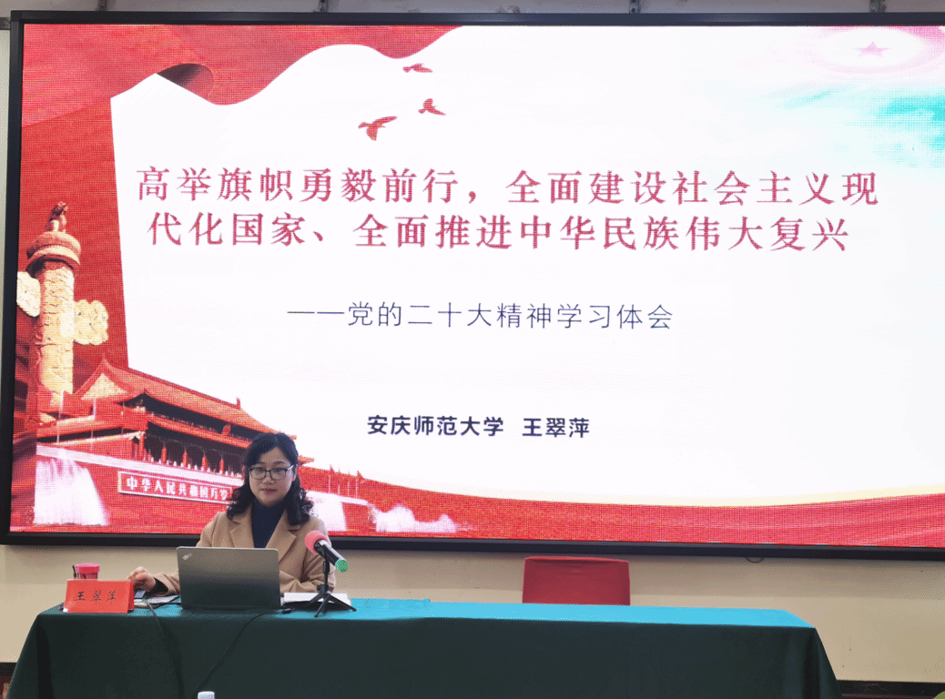 王翠萍教授以“高舉旗幟勇毅前行,全面建設社會主義現代化國家,全面推進中華民族偉大復興”為題,從黨的二十大報告的總體結構、主要內容、“兩個行”與“兩個結合”的學習感悟三個方面分享了黨的二十大精神學習體會。