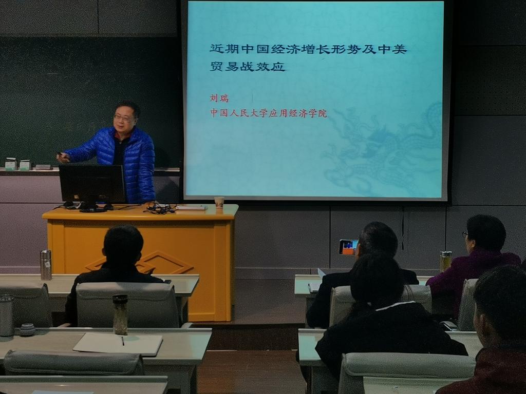 12月13日上午,中國人民大學應用經濟學院劉瑞教授(博士生導師)應邀前往經濟與管理學院講學,為該院研究生、17級國貿、18級金融舉辦了題為“近期中國經濟增長形勢及中美貿易戰效應”的學術講座。講座由經管學院院長楊國才教授主持,該院部分教師參會聆聽了報告。