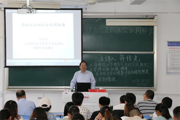 5月29日下午,在文津樓405教室,上海師范大學(xué)哲學(xué)與法政學(xué)院院長(zhǎng)、博士生導(dǎo)師蔣傳光教授來校作“司法公正的社會(huì)認(rèn)同標(biāo)準(zhǔn)”為主題的學(xué)術(shù)報(bào)告。法學(xué)院院長(zhǎng)焦少林教授主持此次報(bào)告,法學(xué)院部分教師和2017級(jí)、2018級(jí)共130余人聆聽了報(bào)告。