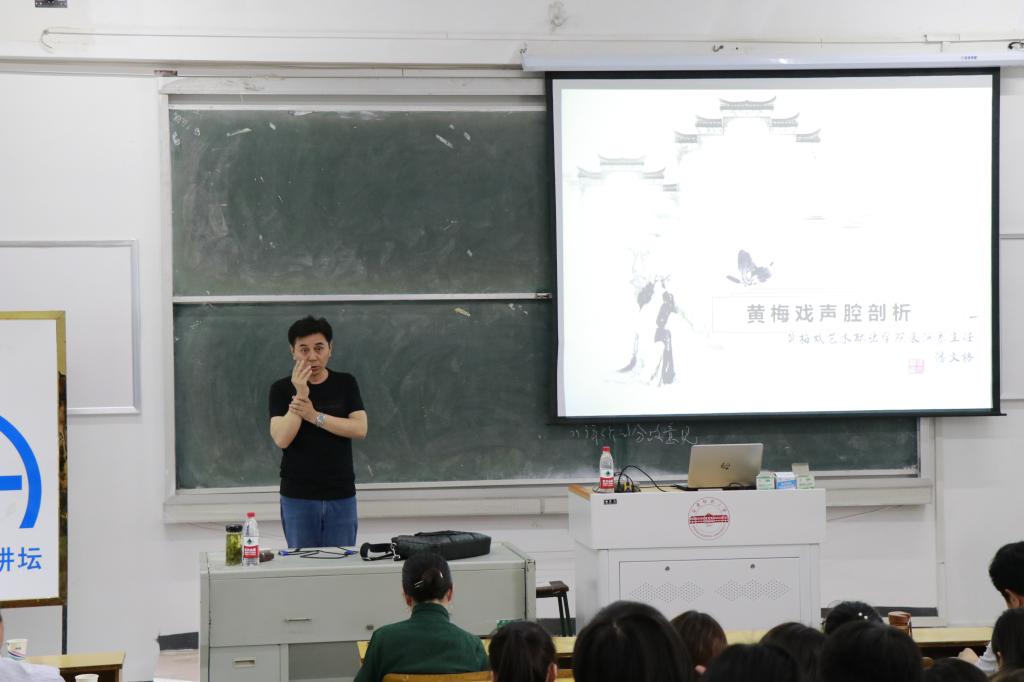 潘文格老師首先從黃梅戲聲腔與唱腔的關系辨析入手,強調聲腔和方言是戲曲劇種藝術特色的集中體現,安慶官話音調柔和,節奏鮮明,這是黃梅戲的特色,是黃梅戲唱腔具有獨特韻味之處。在講座中,潘文格老師列舉了很多黃梅戲唱腔實例,現場親自示范演唱,聲情并茂地剖析黃梅戲唱腔的分類、特點、腔體結構和演唱要領。潘文格老師妙趣橫生的示范表演深受同學們和在場戲迷的喜愛,講座內容既有系統的理論總結,也有潘文格老師多年黃梅戲表演與教學的實踐總結,非常耐人尋味。