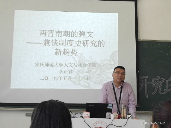 5月22日下午,人文與社會學院李正君博士在龍山校區A103教室作了題為“兩晉南朝的彈文——兼談制度史研究的新趨勢”的學術報告,2018級歷史學(1)班學生聆聽了報告。