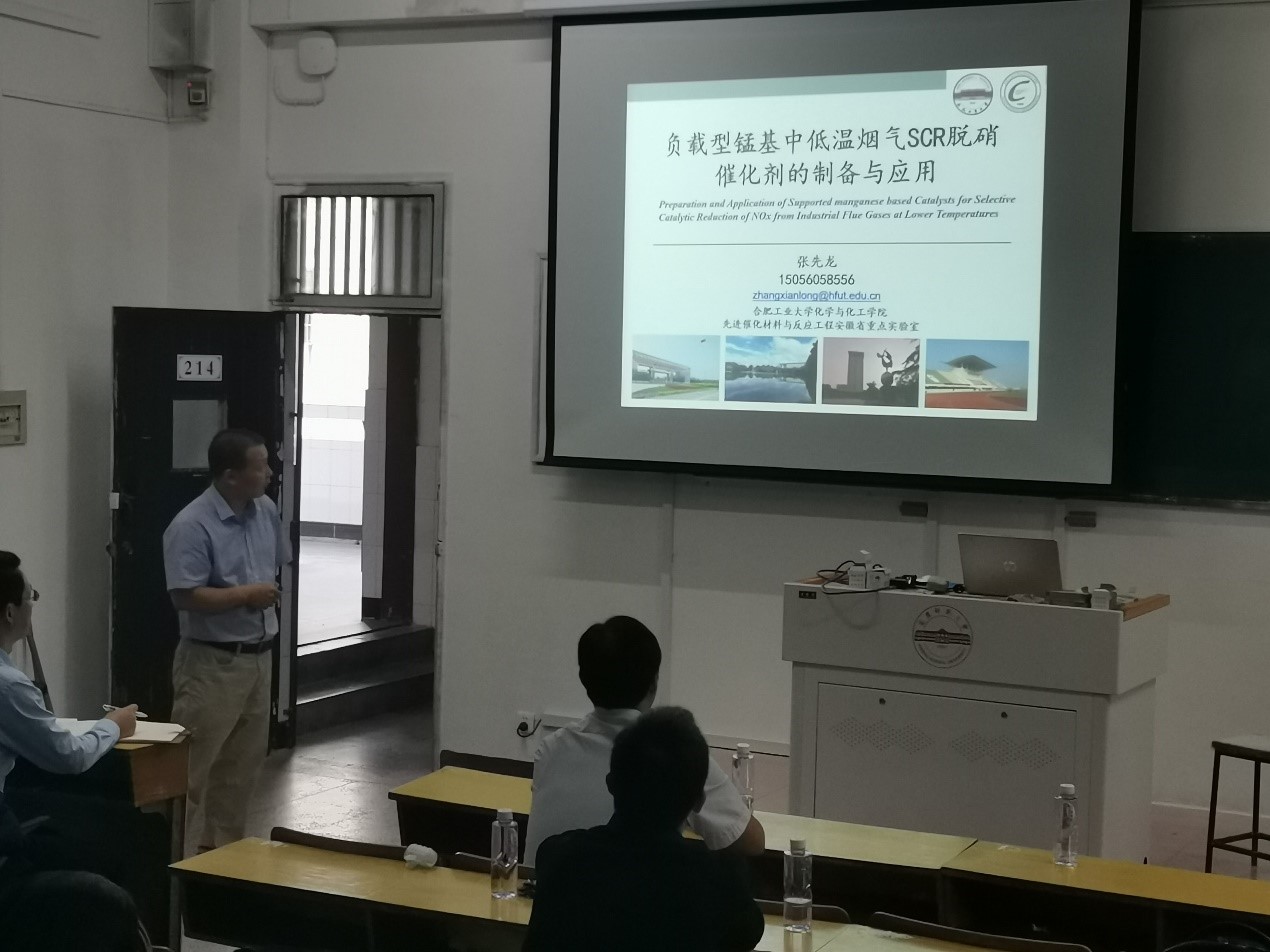 張先龍副教授作了以“煙氣多種污染物超低排放的炭基催化劑及技術”為主題的報告。報告中張教授主要介紹了燃煤煙氣脫硫脫硝及多種污染物一體化脫除和環境催化材料及催化新技術以及課題組最新研究成果。張教授報告內容豐富,拓寬了師生的視野和激發了學生的學習興趣。