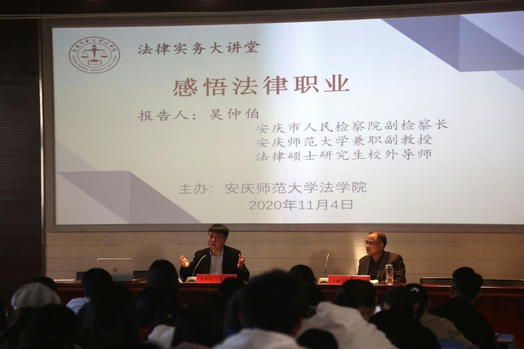 2020年11月4日下午,安慶市檢察院副檢察長、我校兼職副教授吳仲伯受邀蒞臨法學院法律實務大講堂,為我校法學院200多位師生講授了以“感悟法律職業”為主題的報告。法學院院長焦少林教授主持了報告會。