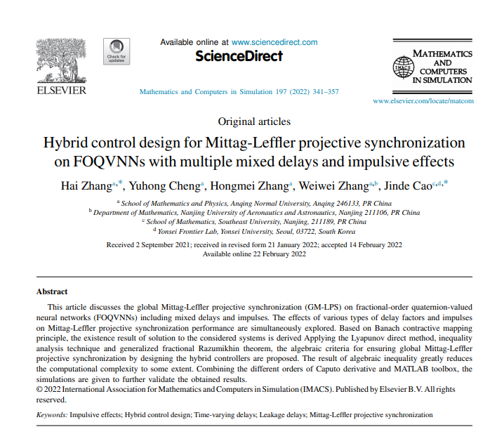 近日,據科睿唯安基本科學指標數據庫ESI(Essential Science Indicators)最新數據顯示,數理學院張海教授團隊在《Mathematics and Computers in Simulation》期刊上發表的研究論文“Hybrid control design for Mittag-Leffler projective synchronization on FOQVNNs with multiple mixed delays and impulsive effects”(在線發表日期:2022年2月,卷:197,頁碼:341-357)被ESI數據庫遴選為高被引論文。《Mathematics and Computers in Simulation》是國際ESI數學學科著名學術期刊,最新影響因子IF = 3.601,為JCR一區期刊。