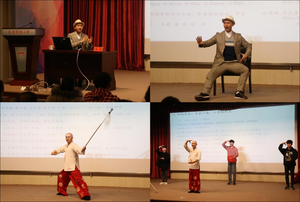 光說不練假把式。除了郝帥自己的動作示范,他還親自指導了三位學生練習“云手”這一經典戲曲程式化動作。“站好右踏步、均成蘭花掌、挺胸立腰”,郝帥在指導同學們身段動作的時候,一再強調戲曲表演“四功五法”的要領和訣竅,告訴同學們這是一代代前輩藝術家藝術實踐的高度總結,大家一定要認真領會、好好傳承。講座過程中,郝帥還聯系“wave”、“stop”、“popping”等街舞動作,生動展現了京劇的表演張力與時尚魅力。