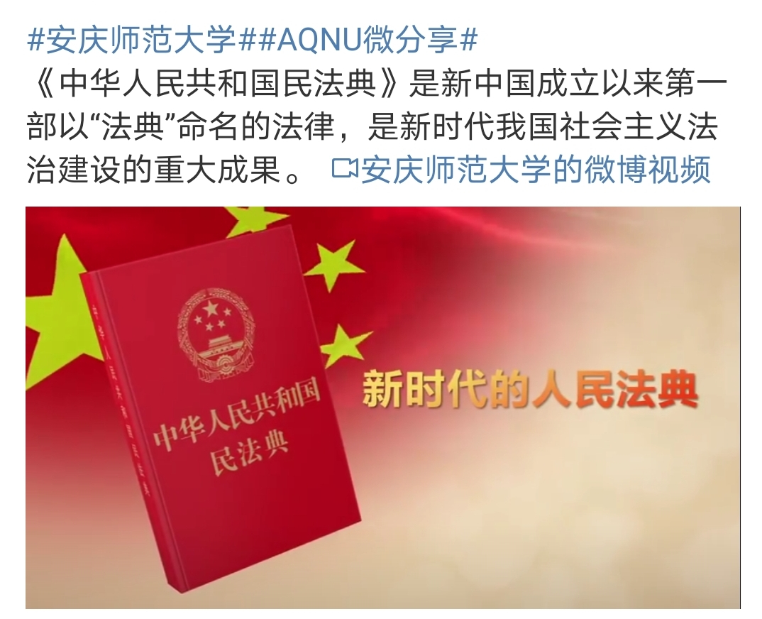 “一圖讀懂:從《民法典》觀習(xí)近平眼中的‘中國(guó)之治’”“生活熱點(diǎn)問題,《民法典》如何回應(yīng)”“一圖讀懂這部‘生活百科全書’”“七大看點(diǎn)解析《民法典》如何回應(yīng)百姓關(guān)切”……近日,安慶師范大學(xué)微信公眾號(hào)、微博等官方新媒體平臺(tái)發(fā)布的《民法典》宣傳文章在師生中火熱傳播。《民法典》是一部固根本、穩(wěn)預(yù)期、利長(zhǎng)遠(yuǎn)的基礎(chǔ)性法律,在中國(guó)特色社會(huì)主義法律體系中具有重要地位,也是“八五”普法的重點(diǎn)內(nèi)容。安慶師范大學(xué)深入堅(jiān)持以習(xí)近平法治思想引領(lǐng)民法典學(xué)習(xí)宣傳工作,在《民法典》頒布一周年之際,學(xué)校印發(fā)了《關(guān)于開展<民法典>宣傳月活動(dòng)的通知》,對(duì)全校學(xué)習(xí)宣傳貫徹《民法典》做出了明確要求和部署,形成了全體師生主動(dòng)知法學(xué)法懂法的良好氛圍。學(xué)校充分利用微信公眾號(hào)、微博等新媒體手段,充分發(fā)揮電子屏、廣播等作用,多措并舉推動(dòng)《民法典》宣傳全覆蓋,形成了多形式、多角度、全方位宣傳解讀民法典格局。