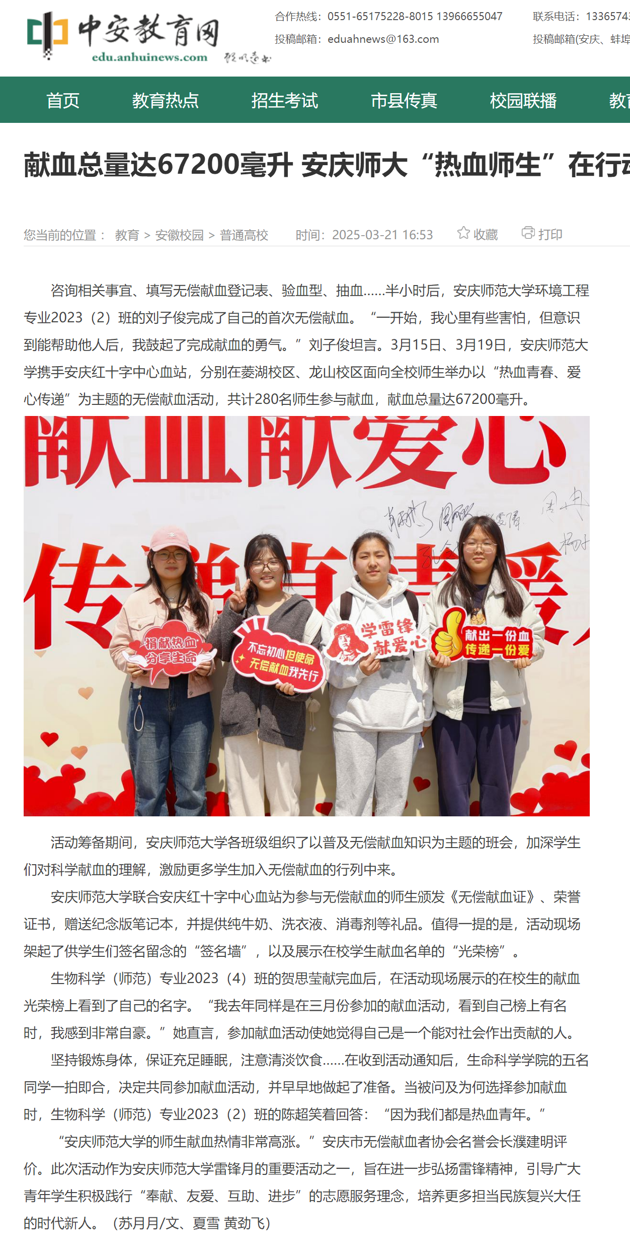 中安教育網(wǎng):獻(xiàn)血總量達(dá)67200毫升 安慶師大“熱血師生”在行動(dòng)