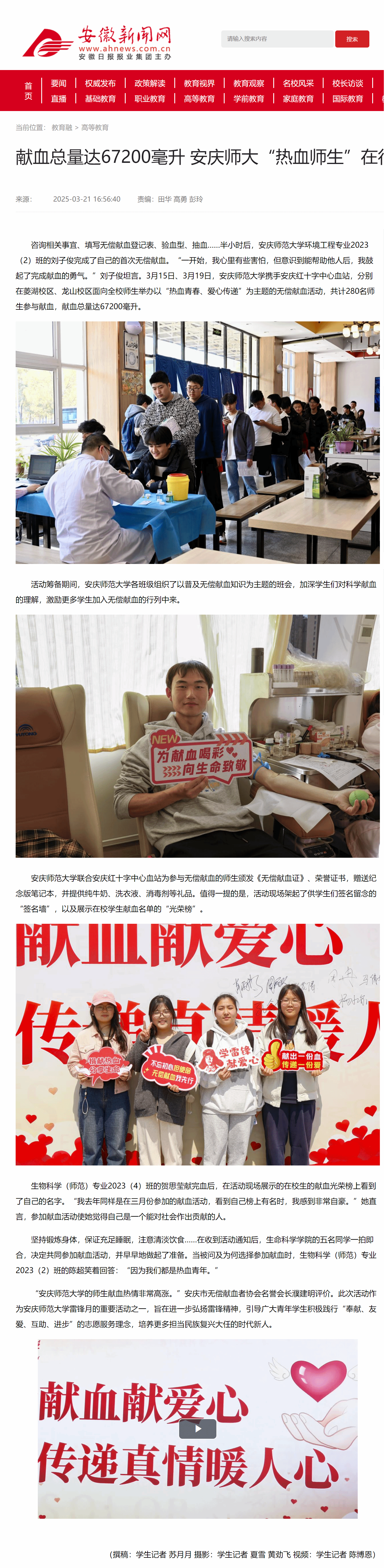 安徽新聞網(wǎng):獻(xiàn)血總量達(dá)67200毫升 安慶師大“熱血師生”在行動(dòng)