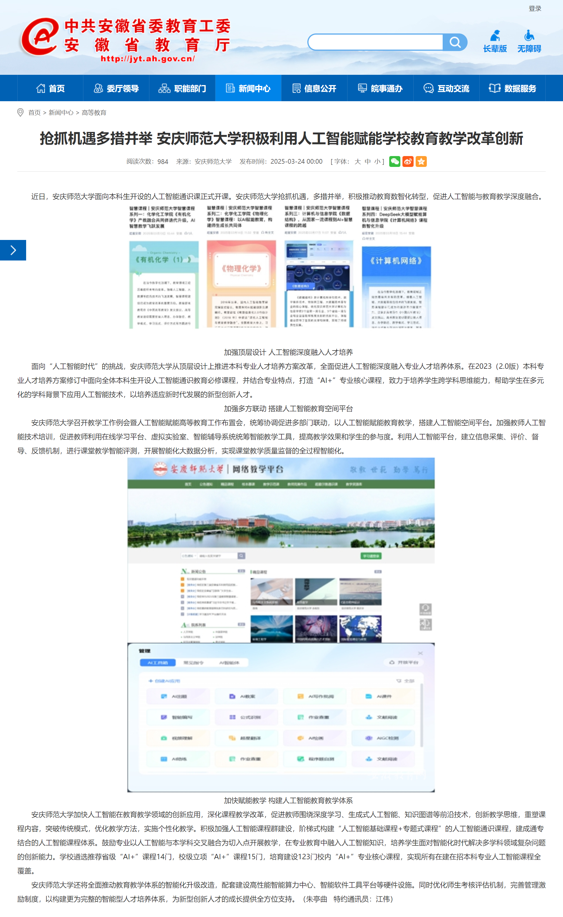 安徽教育網(wǎng):搶抓機(jī)遇多措并舉 安慶師范大學(xué)積極利用人工智能賦能學(xué)校教育教學(xué)改革創(chuàng)新