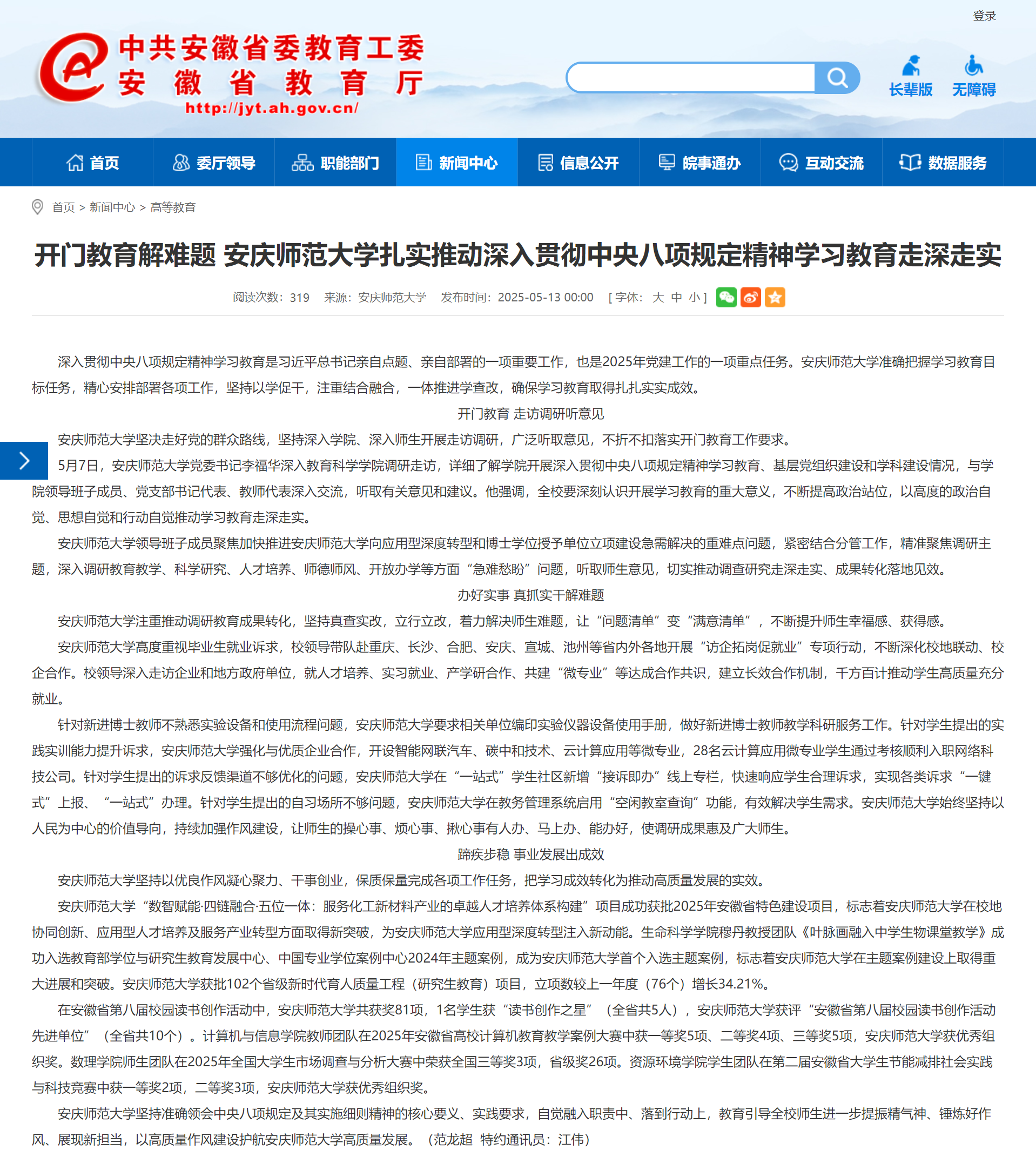 安徽教育網(wǎng):開門教育解難題 安慶師范大學(xué)扎實推動深入貫徹中央八項規(guī)定精神學(xué)習(xí)教育走深走實