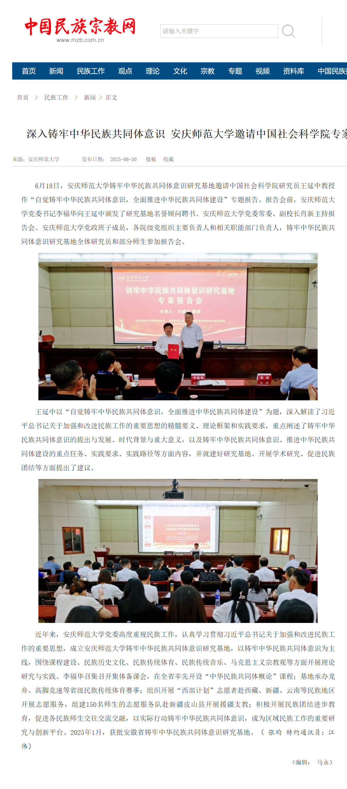 中國民族宗教網:深入鑄牢中華民族共同體意識 安慶師范大學邀請中國社會科學院專家作專題報告