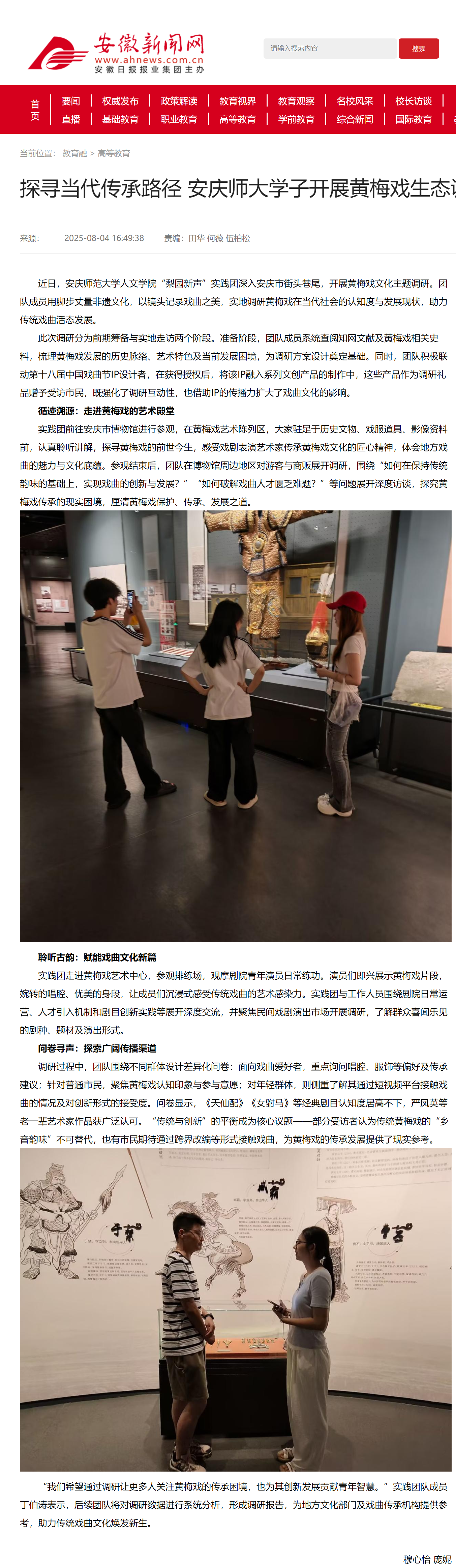 安徽新聞網(wǎng):探尋當(dāng)代傳承路徑 安慶師大學(xué)子開展黃梅戲生態(tài)調(diào)研