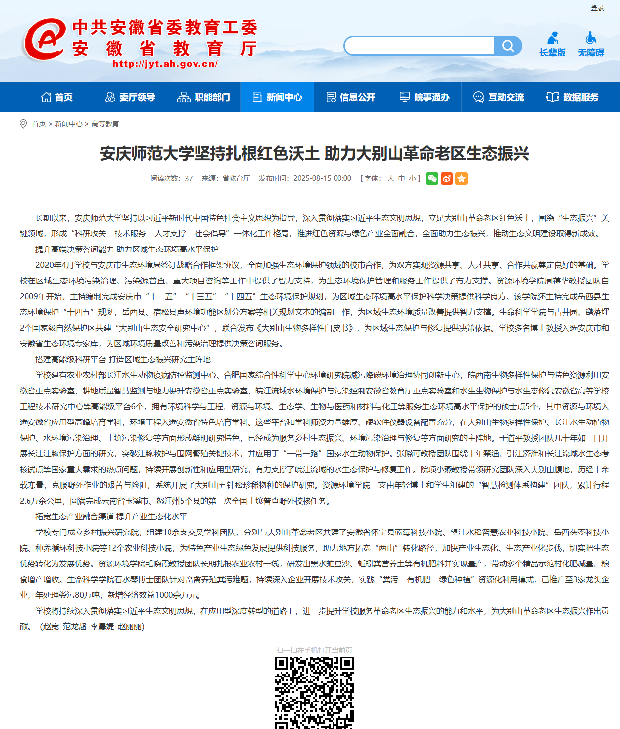 【安徽教育網】安慶師范大學堅持扎根紅色沃土 助力大別山革命老區生態振興https://jyt.ah.gov.cn/xwzx/gdjy/40760532.html