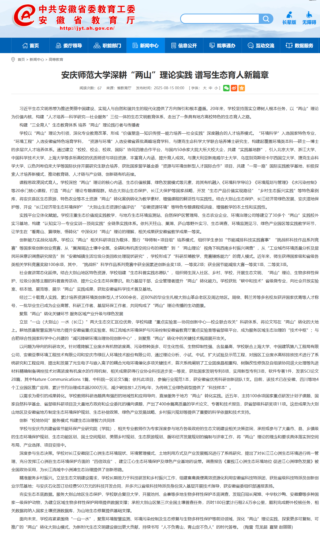 安徽教育網(wǎng):安慶師范大學(xué)深耕“兩山”理論實踐 譜寫生態(tài)育人新篇章