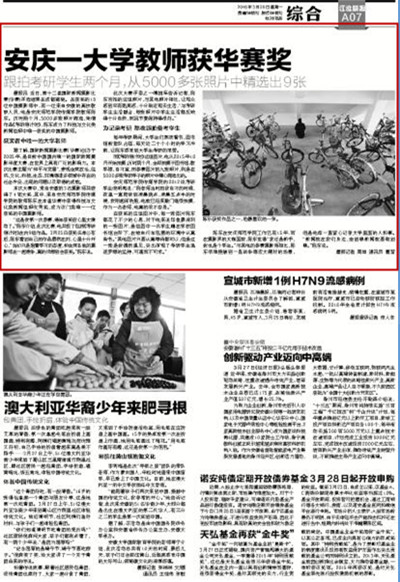 (編者按:近日,具有廣泛國際影響力的國際新聞攝影比賽(華賽)揭曉第十二屆評選結果,我校宣傳部陳東老師以《考研倒計時》獲得科技與文化類新聞組照優秀獎,成為該門類唯一一位獲獎的中國攝影師;與此同時,他也是獲獎者中唯一的大學老師。3月28日,《江淮晨報》刊登新聞《安慶一大學教師獲華賽獎》,講述了陳東老師和《考研倒計時》的故事。)