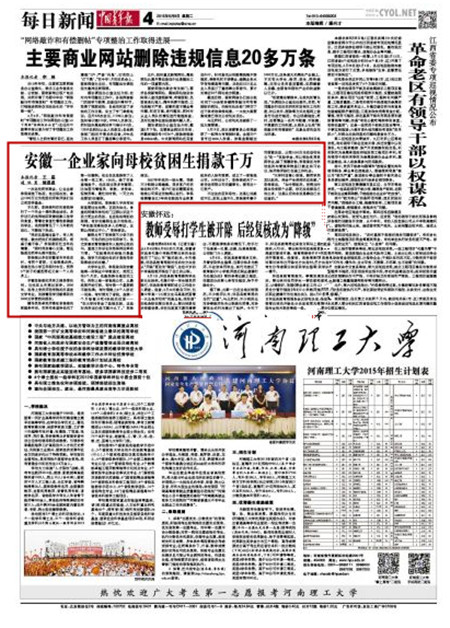 編者按:6月9日,《中國青年報》“每日新聞”版塊刊登我校學生記者采寫稿件《安徽一企業家向母校貧困生捐款千萬》,報道了我校校友、則一千萬助學基金捐助人李保榮在校園、社會學習、創業及創立獎助學基金的經歷與事跡。