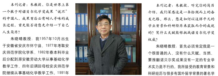 本刊記者:朱教授,聽完你的簡歷介紹,我們深感這是一條拾級而上的奮發之路。那么,您是如何以這樣平凡的學業背景和科研經歷來獲取而今的成就的?憑什么天賦能夠挑戰諾貝爾化學獎