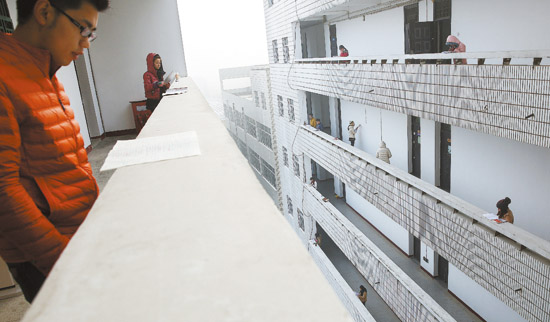 12月8日清晨,安徽省安慶師范學(xué)院菱湖校區(qū)教學(xué)樓的走廊上到處都是考研學(xué)生。一些考生怕誦讀影響到自習(xí)室里的同學(xué),就來到樓梯或者走廊上背書。