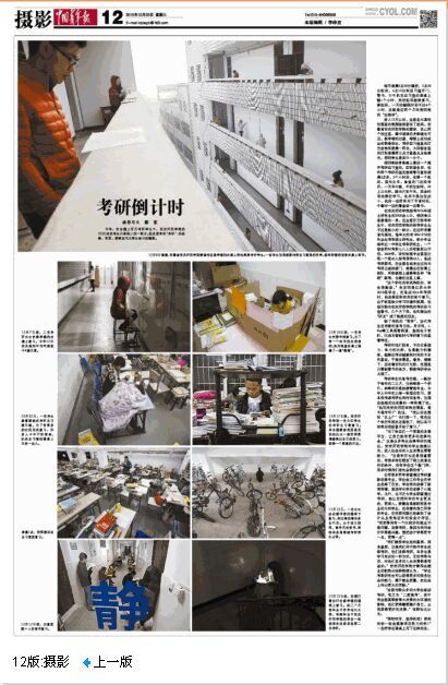 (編者按:12月23日,《中國青年報(bào)》第12版整版刊發(fā)反映我校大學(xué)生沖刺考研的紀(jì)實(shí)攝影“考研倒計(jì)時(shí)”,生動(dòng)反映了我校的良好學(xué)風(fēng)。在《中國青年報(bào)》上以攝影方式整版報(bào)道一所高校的學(xué)生學(xué)習(xí)生活,目前在國內(nèi)高校并不多見。)