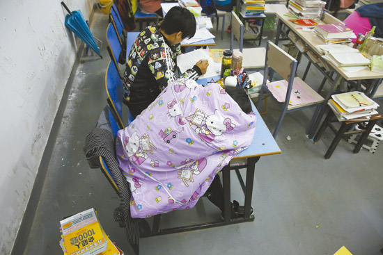 10月30日,一名考生裹著薄被在考研自習(xí)室午睡。為了有更多的時(shí)間用來復(fù)習(xí),許多人中午不回宿舍,趴在自習(xí)室的課桌上午休一會(huì)兒。
