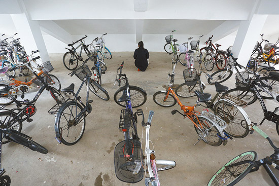 11月13日,一名女生坐在圖書館的樓梯下復(fù)習(xí),周邊停放著許多自行車。由于連日陰雨,室外無法背書,學(xué)校許多角落被考研學(xué)生占領(lǐng)。
