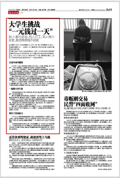 (新安晚報,5月19日)早餐兩個包子一杯豆漿需要3元,中午一葷一素二兩飯需要6元,晚上一碗面條需要5元……這樣的一日三餐是許多大學生的標配,也是他們基礎生活費開銷。如果只給你1元錢,又該如何度過這一天呢?對于安慶師范大學綠源環境保護協會的34名同學來說,這個問題在他們參加活動時就縈繞心頭。5月15日早上8點,34個同學分成6個小組,在菱湖校區集合,上交了手機和多余的錢,就這樣開啟了“一元錢生存體驗”。