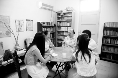 圖為埃絲特在英語角與學生聊天,幫助他們提高口語