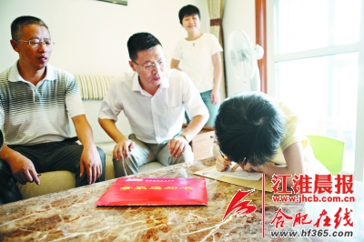 蕙蕙認真地填完了《安慶師范大學學生簡明登記表》,更是激動地接過了鑰匙和慰問金,她的手握成拳頭,撐著下巴,不好意思地說道:“我很開心,也很驚訝。”