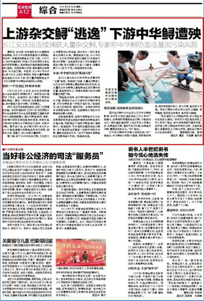 (江淮晨報,9月26日)近日來,安慶漁民在長江捕撈到多條鱘魚,僅僅8月份就連續(xù)捕到38尾鱘魚。而往年一年捕捉的鱘魚也不到10尾。9月23日,安慶市漁政部門專家以及安慶師范大學(xué)生命科學(xué)學(xué)院博士,來到現(xiàn)場對漁民捕獲的鱘魚進(jìn)行鑒別。經(jīng)現(xiàn)場辨認(rèn)發(fā)現(xiàn),漁民捕獲多條鱘魚中,均為雜交鱘。專家稱,從今年6月份開始,因為長江上游水庫泄洪,導(dǎo)致大量養(yǎng)殖鱘魚逃逸到長江中下游,而大量養(yǎng)殖鱘魚會對“水中大熊貓”中華鱘生存造成巨大威脅。