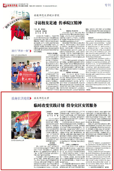 (安徽青年報,8月17日)7月14日,安慶師范大學數(shù)學與計算科學學院“繪夢·燃青春”實踐服務團前往楊橋鎮(zhèn)螺山村小學暑期田園支教活動,因我國南方部分地區(qū)強降雨導致的洪澇災害,受災群眾被集中安置在螺山小學。為了支持災后重建工作,面對災難,這支隊伍沒有退縮,臨時改變實踐計劃,主動申請支援抗洪救災。