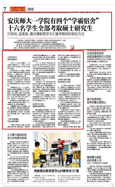 (皖江晚報,5月26日)一個宿舍出一個研究生并不稀奇,一個宿舍四個人全都考上研究生就比較少見了。但是,在安慶師范大學資源環境學院,這樣的宿舍竟然有四個,被大家稱為“學霸宿舍”。